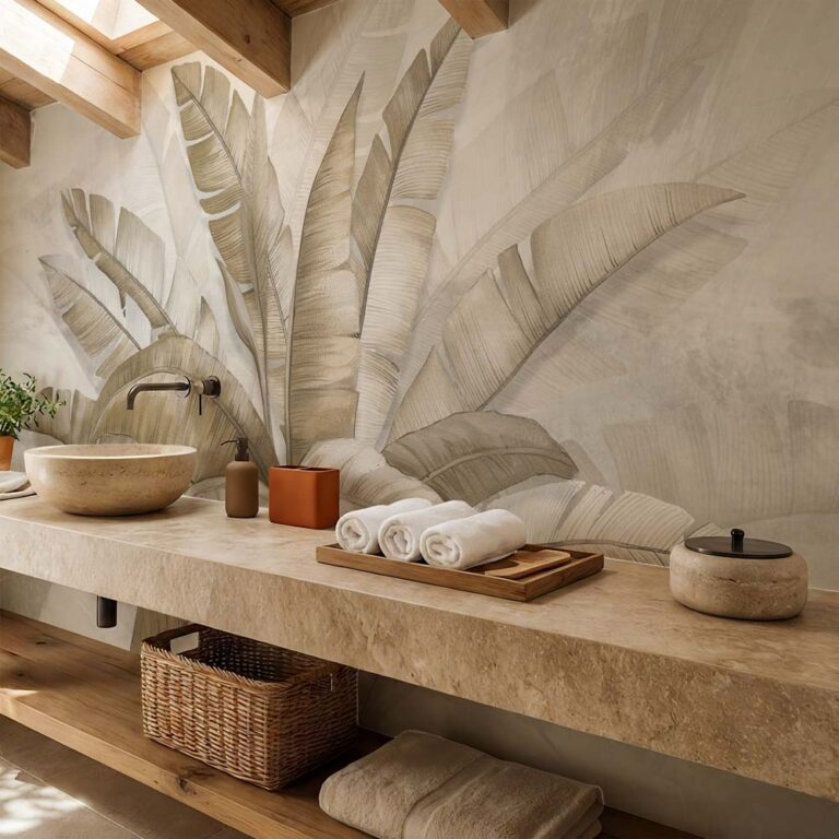 Op deze manier haal je een behang voor jouw badkamer in huis dat volledig aansluit bij jouw stijl en wensen โ van een luxe wellnessgevoel tot een frisse, moderne look.