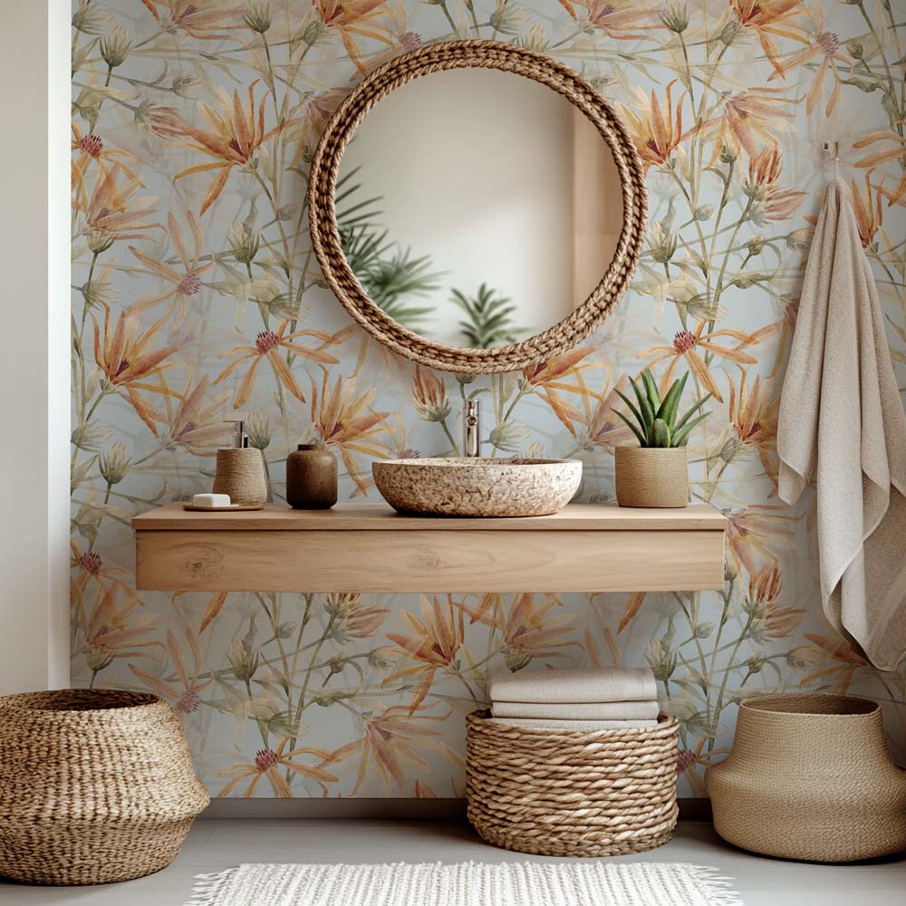 Creëer een serene en stijlvolle badkamer met badkamer behang Aquarel bloemen patroon. De zachte, aquarelkleuren en elegante bloemenmotieven brengen een frisse, rustgevende sfeer in je badkamer, waardoor elke ochtend en avond een plezierige ervaring wordt.