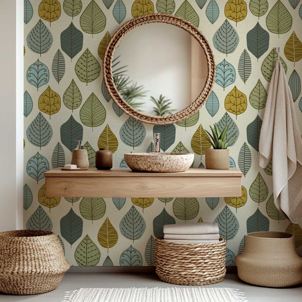 Breng een frisse en kalmerende sfeer in je badkamer met badkamer behang Blauw groene bladeren. De zachte blauw- en groentinten gecombineerd met elegante bladeren creëren een natuurlijke, rustgevende uitstraling die perfect is voor een ontspannende badkameromgeving.
