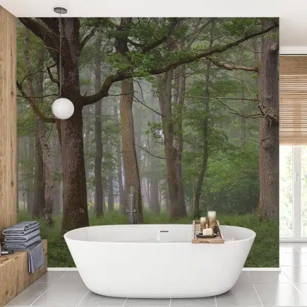 Verander je badkamer in een rustgevende oase met het Bos in de mist behang. Het mysterieuze bosontwerp met zachte, mistige tinten brengt een gevoel van sereniteit en diepte, waardoor je badkamer een echte ontspanningsruimte wordt.