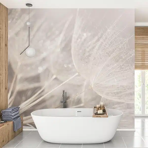 Breng rust en frisheid in je badkamer met het badkamer behang Dandelion in lichte tinten. Het subtiele paardenbloemmotief in zachte kleuren creëert een serene sfeer.