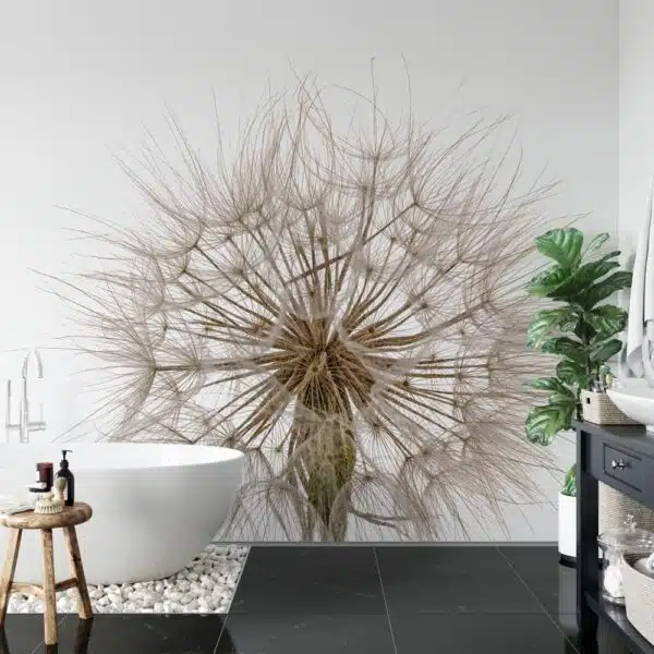Creëer een frisse en lichte uitstraling in je badkamer met het badkamer behang Dandelion op witte achtergrond. Het delicate paardenbloempatroon op een witte basis zorgt voor rust en elegantie.