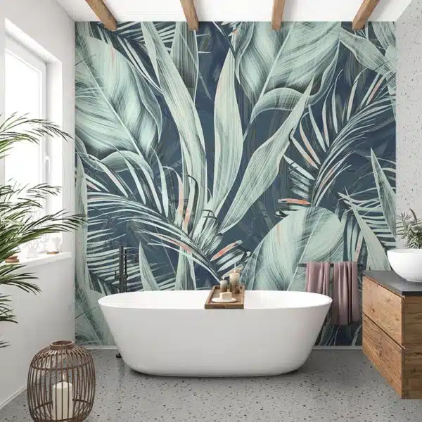 Breng een frisse, natuurlijke sfeer in je badkamer met het badkamer behang Jungle bladeren in groentinten. Het weelderige bladpatroon creëert een tropische, rustgevende uitstraling.