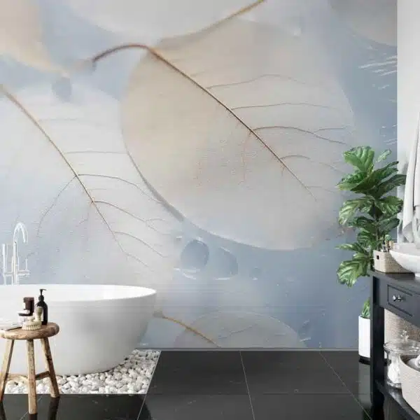 Breng een frisse en serene sfeer in je badkamer met het badkamer behang Lichte blaadjes met waterdruppels. Het delicate patroon van zachte bladeren met subtiele druppels creëert een natuurlijke, rustgevende uitstraling.
