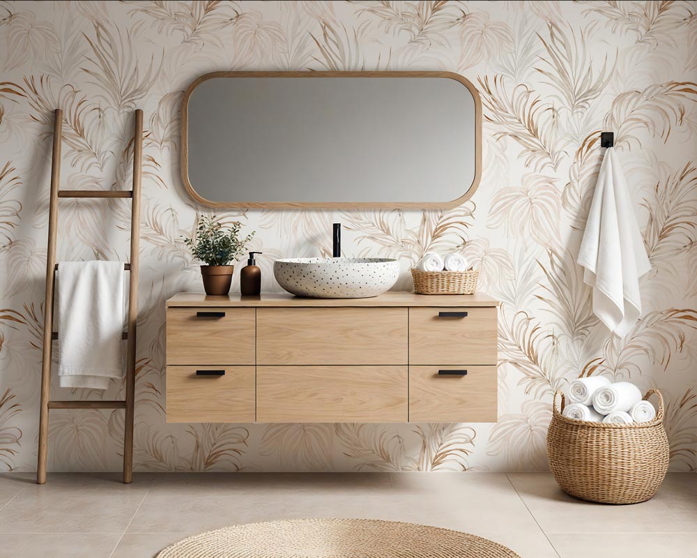 Het ontwerp combineert elegantie met rust en past moeiteloos bij zowel lichte als donkere badkamermeubels. Of je nu een complete make-over wilt of één accentmuur wilt creëren: dit badkamerbehang zorgt voor sfeer zonder te overheersen. Ideaal te combineren met strakke tegels voor een stijlvol en evenwichtig geheel.