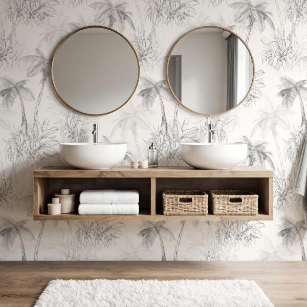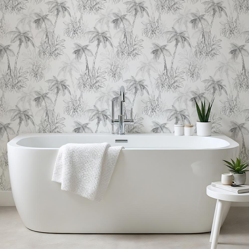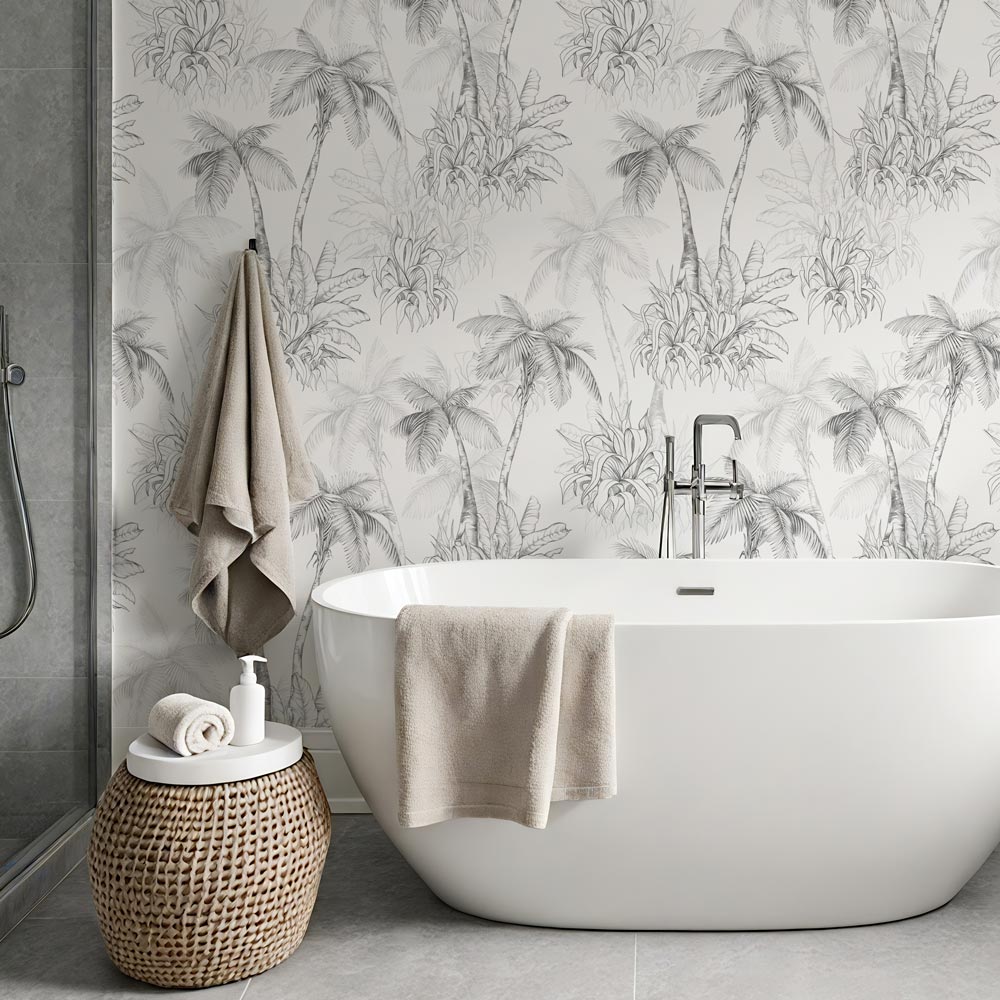 Breng een tropisch gevoel in je badkamer met ons badkamer behang Palmboom patroon. Dit stijlvolle ontwerp combineert sierlijke palmbomen met subtiele, grijze tinten, waardoor je ruimte een frisse, ontspannen uitstraling krijgt. Het behang creëert een luxe, exotische sfeer die doet denken aan een zonnige vakantie, zonder dat je je huis hoeft te verlaten.
