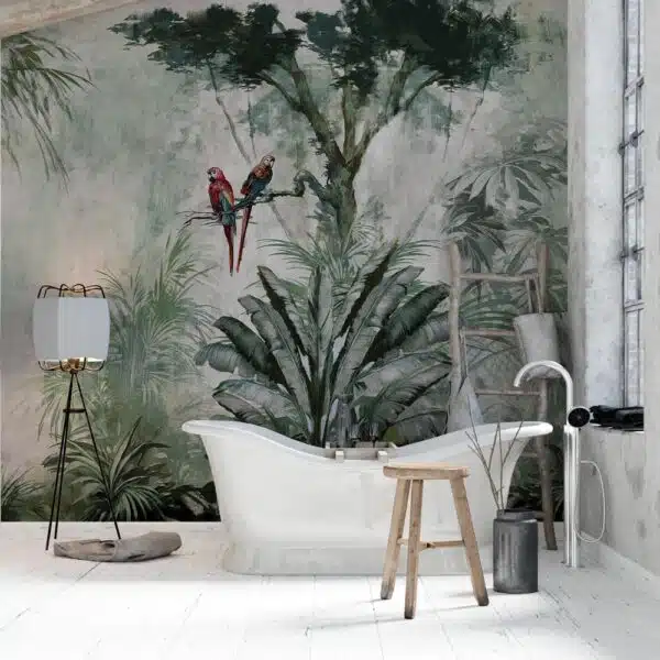 Breng leven, kleur en exotische flair in je badkamer met het badkamer behang Papegaaien in de jungle. De levendige print met gekleurde papegaaien tussen weelderige bladeren zorgt direct voor een tropische sfeer. Voor wie houdt van natuur, kleur en een unieke muur vol karakter.