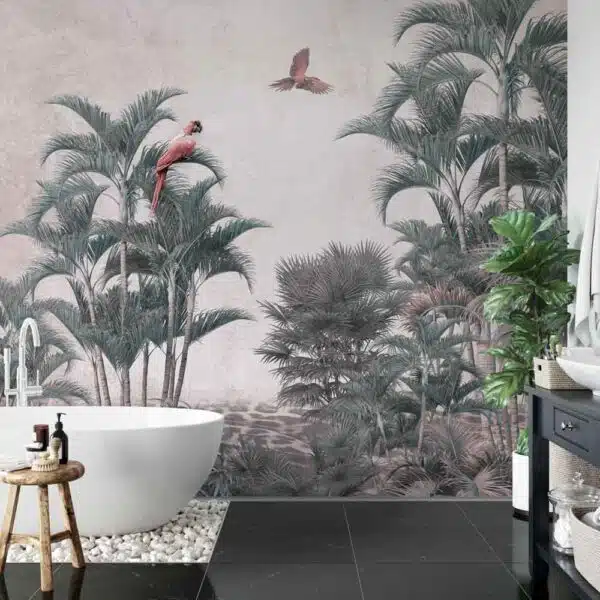 Breng een kleurrijke en levendige sfeer in je badkamer met het badkamer behang Papegaaien vliegen in de jungle. Hetpatroon van vliegende papegaaien en weelderige junglegewassen creëert een exotische uitstraling.