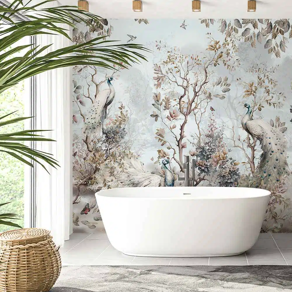 Geef je badkamer een luxueuze en elegante uitstraling met het badkamer behang Pauw in klassieke botanische tuin. Het gedetailleerde ontwerp van een sierlijke pauw te midden van weelderige bloemen en planten combineert verfijning met natuurlijke schoonheid.