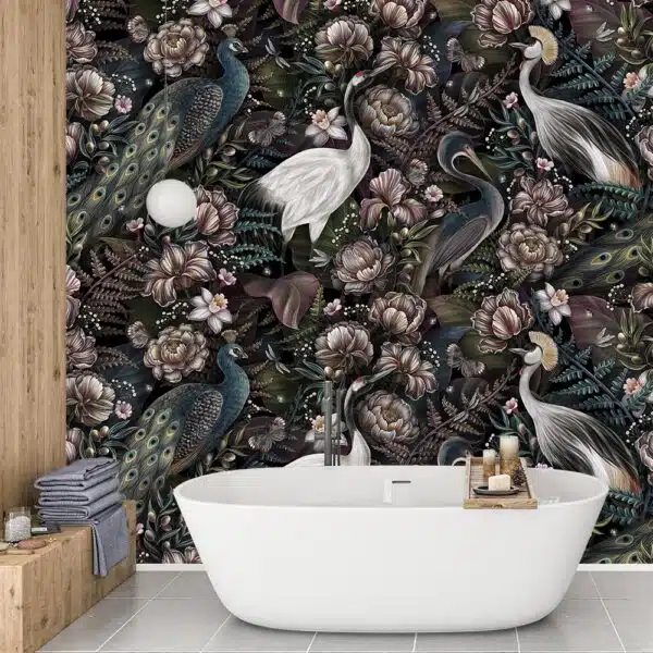 Stel je voor: een ochtend in een exotisch paradijs, waar pauwen hun veren spreiden, pelikanen rustig over het water glijden en kraanvogels elegant tussen het riet staan. Met het badkamer behang Pauw, pelikaan & kraanvogel patroon breng je deze tropische wereld rechtstreeks in je badkamer.