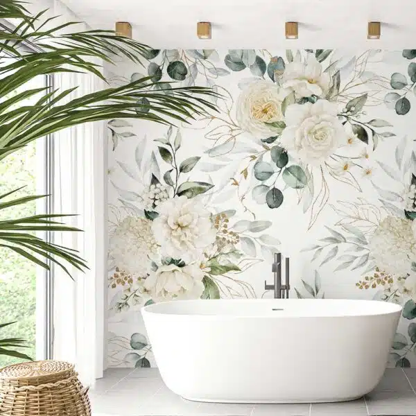 Jouw badkamer is toe aan opknapbeurt? En heb je liever iets anders dan alleen tegels aan de muur? Dan is het badkamer behang Rozen en eucalyptus patroon precies wat je zoekt. Wanneer je het badkamer behang voorziet van een extra finish laag, dan zorg je ervoor dat het behang beschermt is tegen vocht. Daardoor kan dit behang ook in vochtige ruimtes geplakt worden.