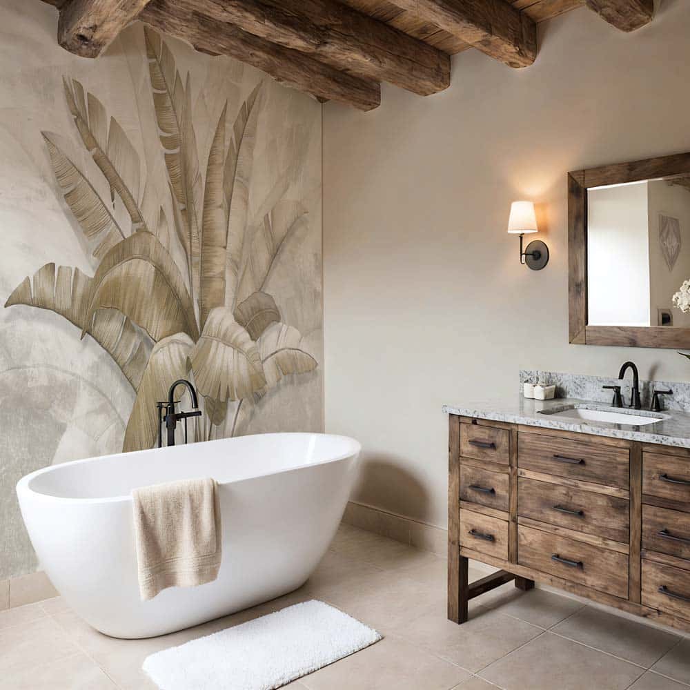 Dit subtiele tropische design brengt diepte en warmte zonder te overheersen, waardoor het ideaal is voor wie houdt van een serene spa-look in huis. Prachtig te combineren met lichte tegels, houtaccenten of zwarte details voor een tijdloos en harmonieus geheel.
