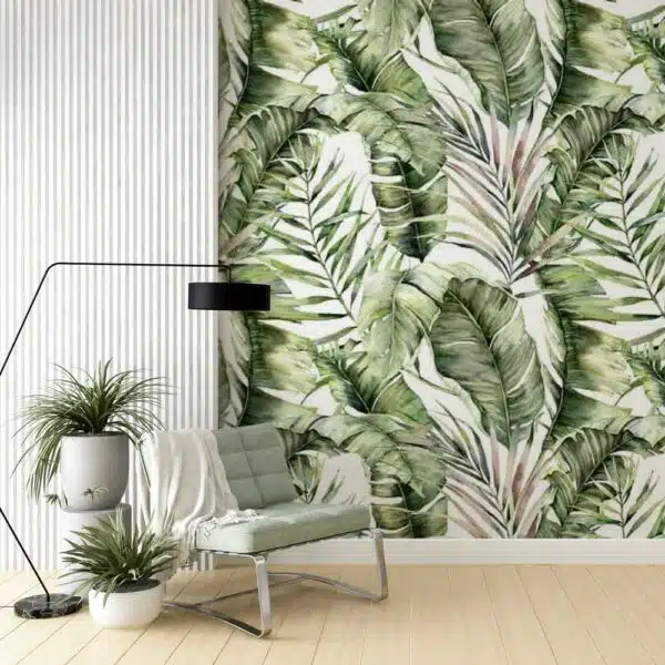 De weelderige groene bladeren op dit fotobehang Bananen en palmbladeren zorgen voor een levendig en fris accent op je muur, ideaal voor een exotische en natuurlijke uitstraling. Perfect voor liefhebbers van botanische prints en een jungle vibe in het interieur.