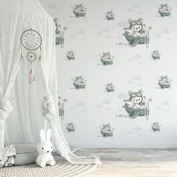 Het kinderbehang Beertje in een vliegtuig is eenvoudig aan te brengen, zowel door de doe-het-zelver als een ervaren behanger. Het behang is milieuvriendelijk geproduceerd en bovendien PVC vrij. Daardoor is dit type kinderbehang uitstekend geschikt voor de slaapkamer.