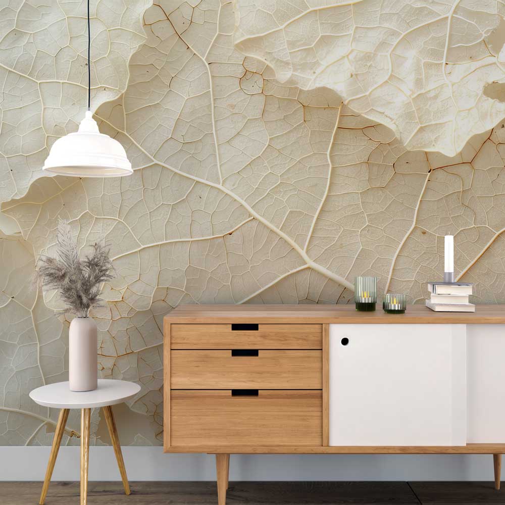 Een ode aan de stilte van de natuur. Het fotobehang Bladeren met lichte nerven brengt verfijnde bladstructuren tot leven in zachte, natuurlijke tinten. De lichte nerven zorgen voor een elegant lijnenspel dat rust en diepte toevoegt aan je interieur. Perfect voor wie op zoek is naar een subtiele botanische touch met een serene uitstraling.