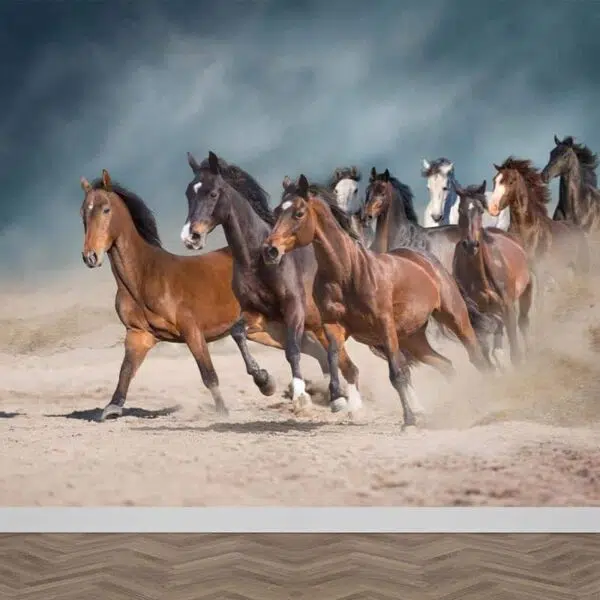 Dit fotobehang Paarden in galop is perfect voor een stoere woonkamer, een sportieve slaapkamer of een ruimte die kracht en avontuur uitstraalt. Het brengt niet alleen beweging in je interieur, maar ook een gevoel van ongebondenheid en gratie.