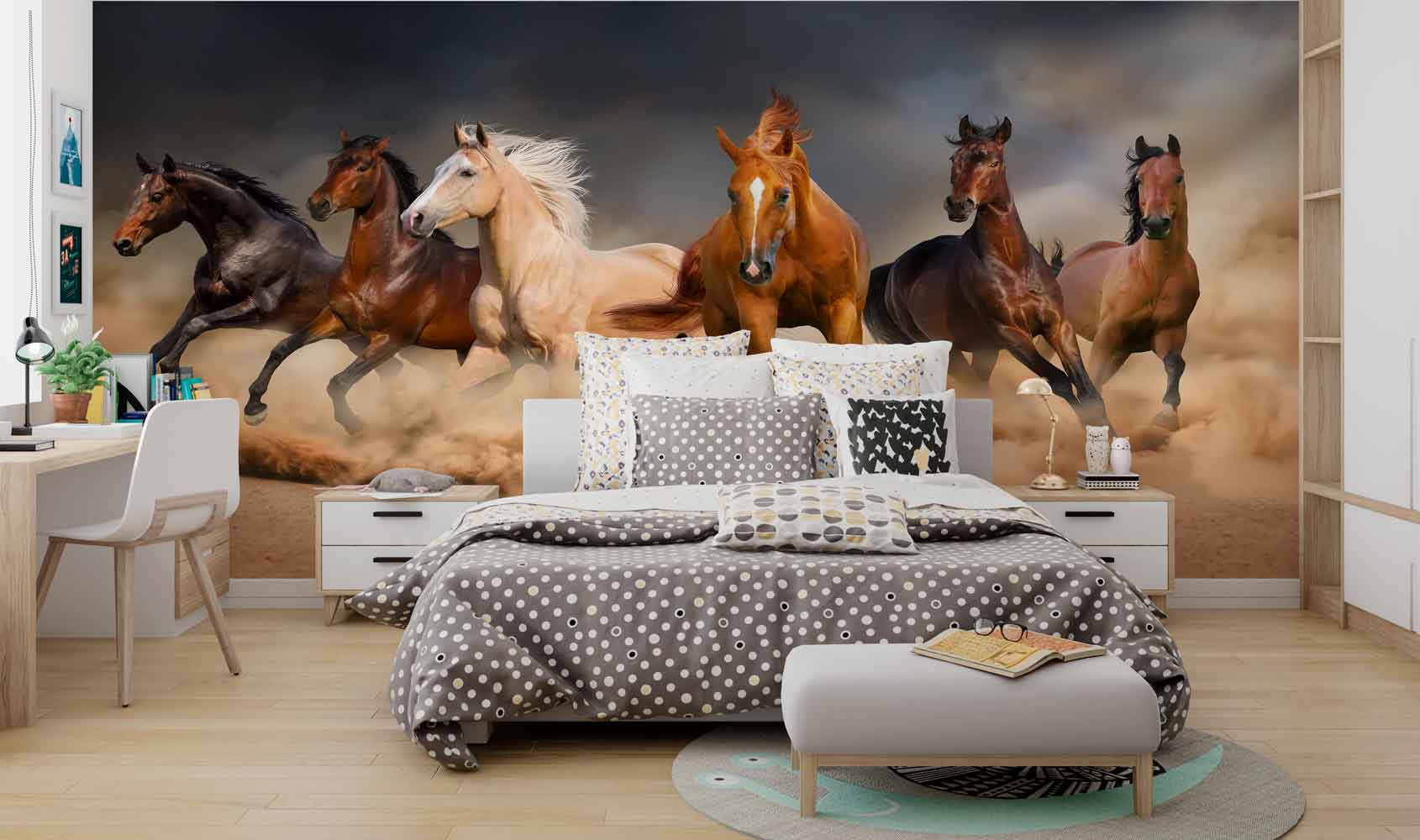 Dit behang combineert de schoonheid van paarden met een sterke visuele impact voor een indrukwekkend decor.