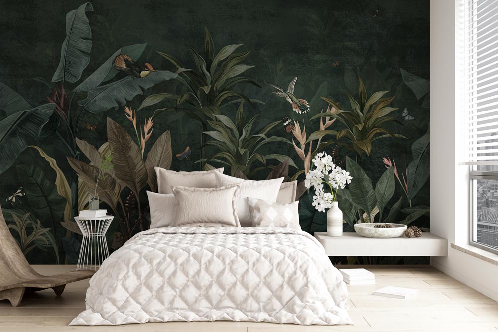 Haal de energie van de jungle in huis met dit fotobehang jungle met vogels. Tussen weelderige bladeren en exotische planten vliegen kleurrijke vogels die het ontwerp een speels en levendig karakter geven. De rijke groentinten en verfijnde details zorgen voor diepte en een natuurlijke balans tussen rust en dynamiek.