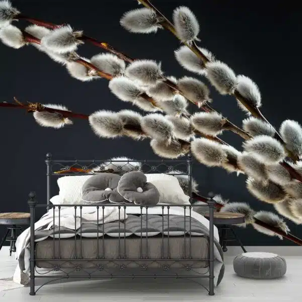 De delicate katjes in contrast met de diepe, donkere achtergrond op het fotobehang Katjestak op donkere achtergrond creëert een elegant en rustiek effect. Perfect voor wie houdt van subtiele natuurdetails en een rustige, chique uitstraling.