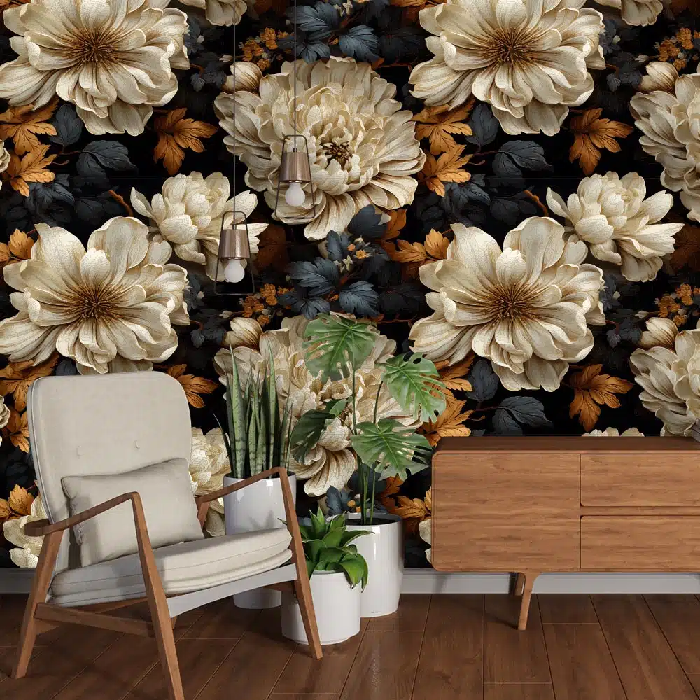 Dit op maat gemaakte behang vormt een stijlvol statement in bijvoorbeeld de woonkamer, slaapkamer of eetkamer, en zorgt voor een warme, elegante sfeer met een artistieke twist.
