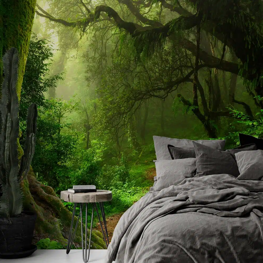 Haal de betovering van de natuur in huis met dit fotobehang Mysterieus bos. Diep groene bomen, nevelige paden en subtiele lichtaccenten creëren een mysterieuze en sfeervolle sfeer in elke ruimte. Perfect voor de woonkamer, slaapkamer of werkruimte waar je een rustgevende en toch intrigerende uitstraling wilt toevoegen.