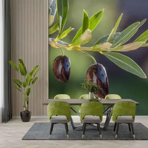 Breng de warme, rustgevende sfeer van het Middellandse Zeegebied in huis met dit fotobehang van olijven aan een tak.