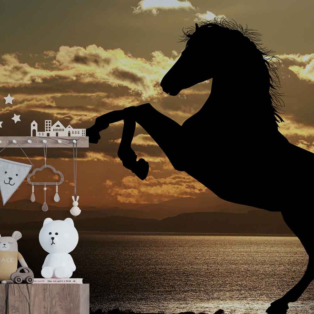 Breng de kracht van het paard in huis met het fotobehang Paard in Avondzon. Het silhouet van een paard tegen een warme, gouden zonsondergang straalt rust, vrijheid en elegantie uit. Perfect voor woonkamer, slaapkamer of werkruimte die je een sfeervolle, natuurlijke uitstraling wilt geven.