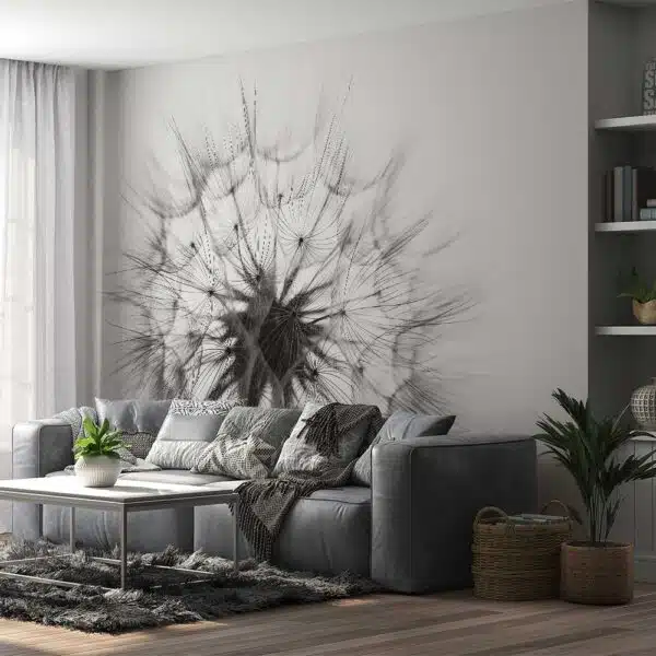 De subtiele kleurencombinatie van grijs, zwart en wit in het delicate paardenbloemontwerp op het fotobehang Paardenbloem grijs zwart wit zorgt voor een rustige en stijlvolle sfeer. Perfect voor een moderne of tijdloze inrichting die houdt van ingetogen schoonheid.