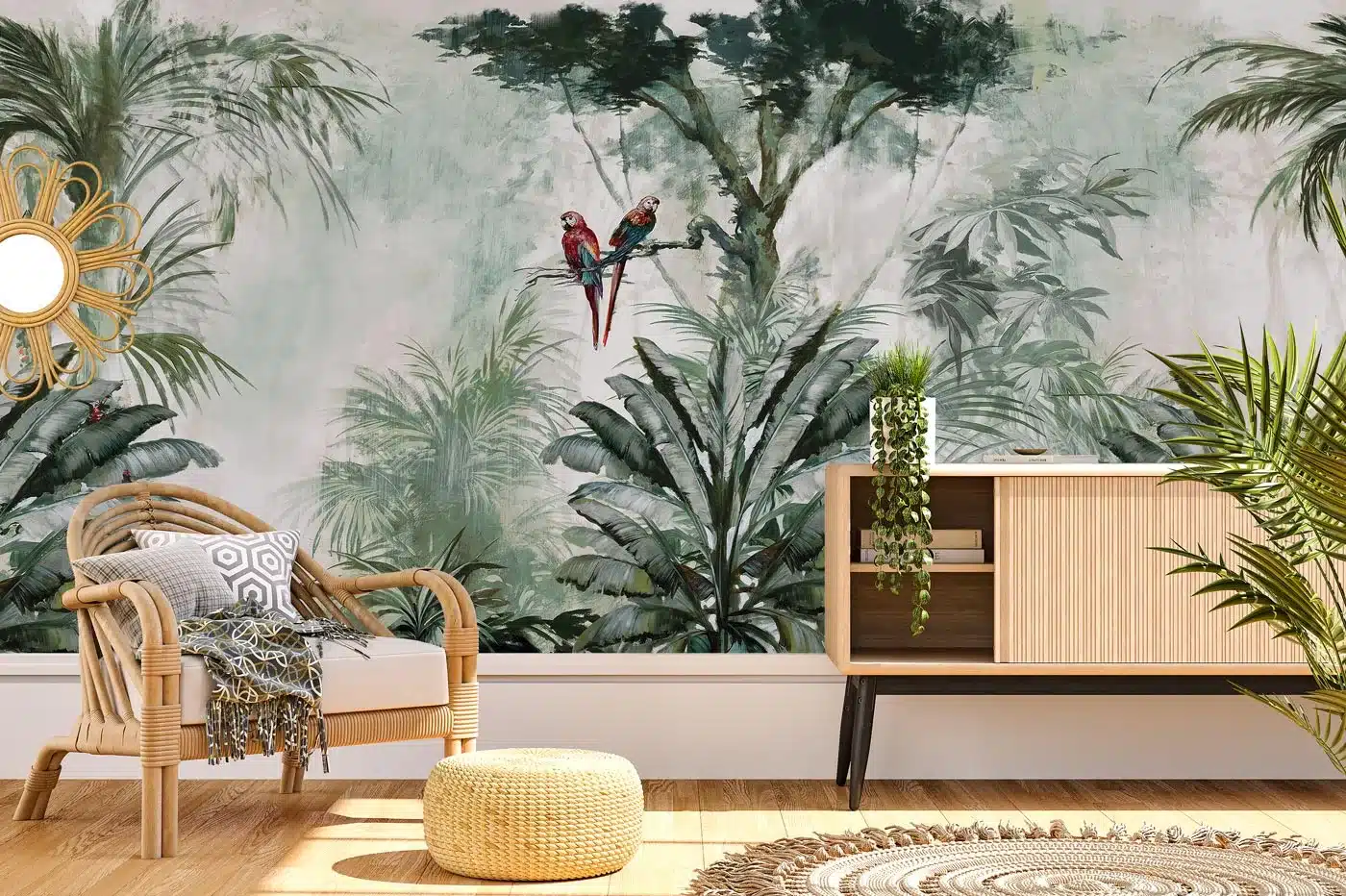 De felgekleurde papegaaien tussen het groene bladerdek brengen niet alleen een gevoel van vrijheid, maar zorgen ook voor een frisse, vrolijke uitstraling in je interieur. Perfect voor wie houdt van een natuurlijke, speelse en inspirerende woonstijl.
