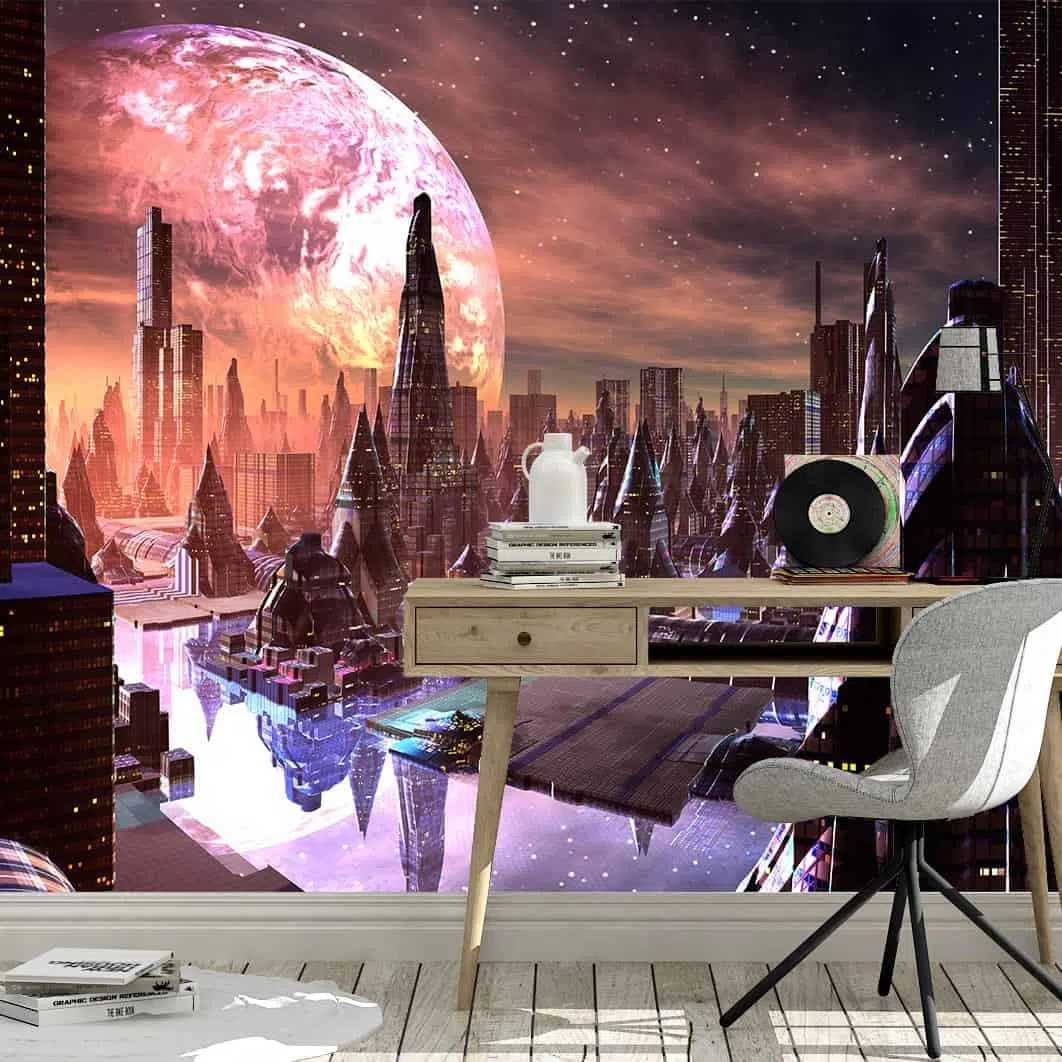 Stap in de toekomst met dit fotobehang Science fiction stad. Glanzende wolkenkrabbers, futuristische verlichting en indrukwekkende architectuur creëren een dynamische, hightech sfeer in je interieur.