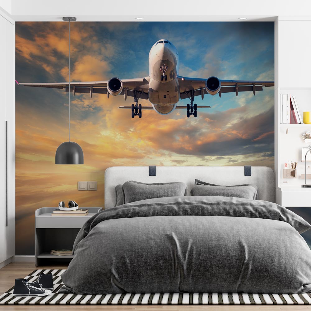 Breng een gevoel van avontuur en elegantie in huis met het fotobehang Vliegtuig in avondschemer. Het ontwerp toont een vliegtuig dat door de lucht zweeft terwijl de zon ondergaat, met warme schemerige tinten die een rustgevende en sfeervolle ambiance creรซren.