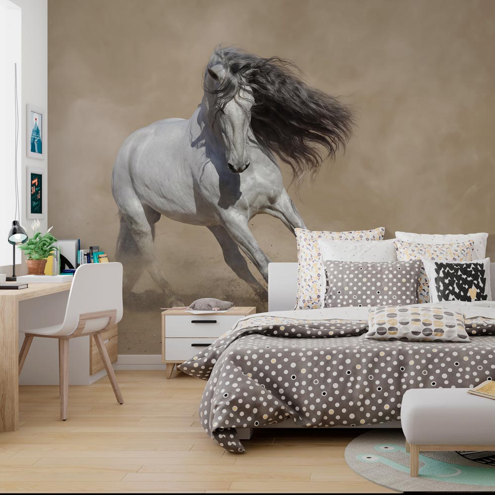 Dit paarden behang is perfect voor slaapkamers en tienerkamers, waar het een rustgevende en inspirerende sfeer creรซert. Ook in de woonkamer kan het dienstdoen als krachtige eyecatcher, terwijl het in een kantoor of werkruimte energie en focus stimuleert.