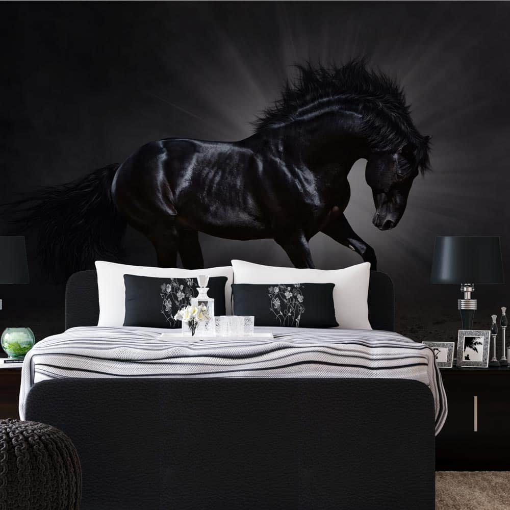 De diepte en het contrast van het zwarte paard tegen de achtergrond creรซert een indrukwekkende en stijlvolle uitstraling die elke ruimte verandert.