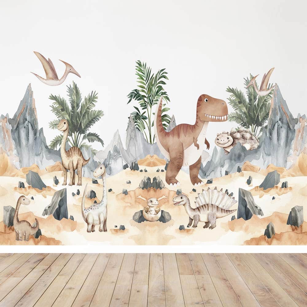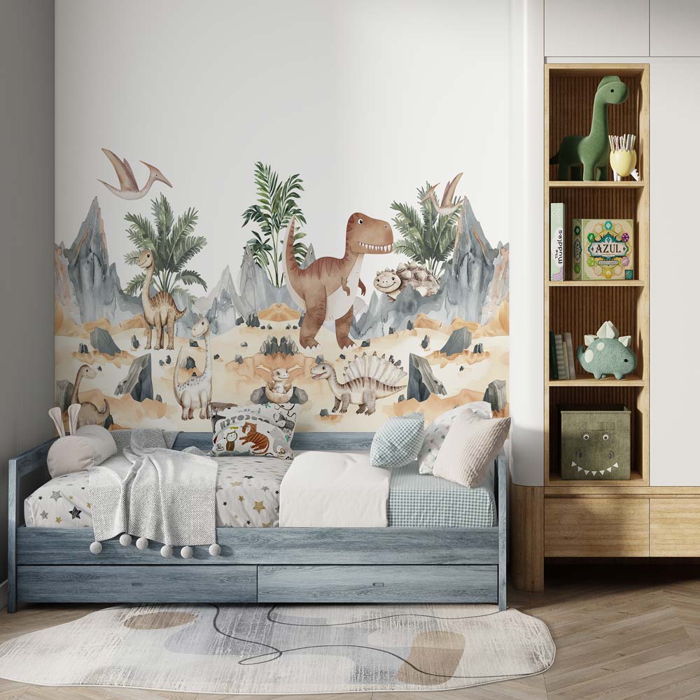 Breng een stoer maar vrolijk avontuur naar de kinderkamer met Kinderbehang Dino familie. Deze vriendelijke dinosaurussen vormen samen een gezellige familie en zorgen voor een speelse, fantasierijke sfeer zonder spannend te zijn. De zachte kleuren en warme illustraties maken het behang perfect voor een kamer waarin je kind zich veilig voelt én zijn nieuwsgierigheid kan laten groeien.