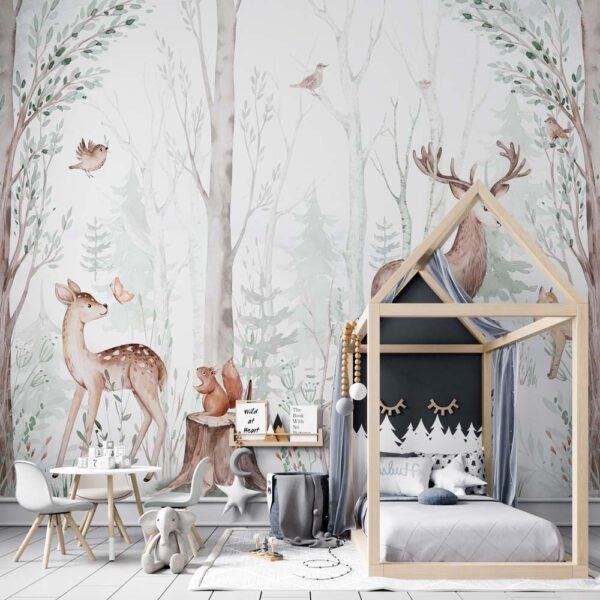 Breng een vleugje magie en rust in de kinderkamer met Kinderbehang Hertjes in het bos. Tussen zachte bomen en warme natuurtinten dwalen lieve hertjes door een sprookjesachtig bos, waardoor een veilige en dromerige sfeer ontstaat. Dit behang prikkelt de fantasie van je kind en maakt van de kamer een plek waar spelen, ontdekken en ontspannen vanzelf samenkomen.