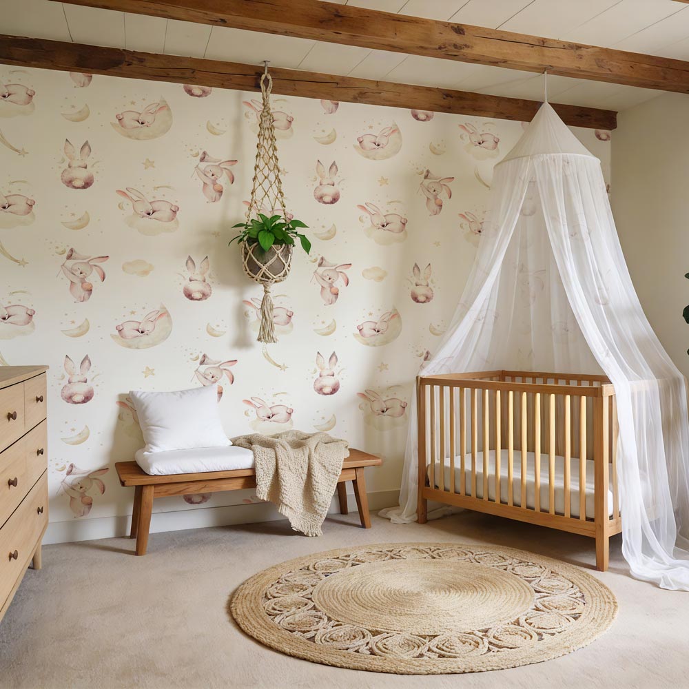 Elk kinderbehang Konijntje op wolkjes maken wij volledig op maat, ideaal voor babykamers, peuterkamers en kinderkamers. Dankzij de digitale drukproef weet je zeker dat het ontwerp perfect past bij jouw muur en interieur. Zelfs bij schuine wanden of meubels zoals hoogslapers, bedden of kasten kun je aangeven waar rekening mee gehouden moet worden, zodat het behang naadloos aansluit.