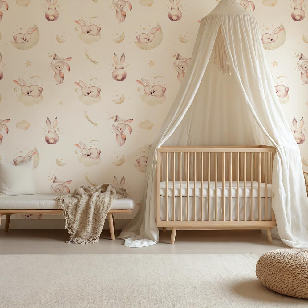 Laat de kinderkamer stralen met een vleugje magie dankzij ons kinderbehang Konijntje op wolkjes. Dit charmante ontwerp toont een schattig konijntje dat vredig op zachte, pluizige wolkjes rust, omringd door een lichte, dromerige achtergrond. Het behang creëert een rustgevende en vrolijke sfeer, perfect voor zowel slaapkamers als speelruimtes.