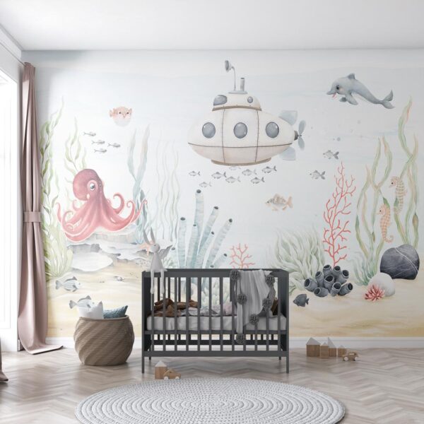 Breng de magie van de oceaan tot leven in de kinderkamer met dit betoverende kinderbehang Onderwaterwereld. In zachte aquareltinten duiken een vrolijke dolfijn, een nieuwsgierige inktvis en een speelse duikboot op tussen de golven. Het ontwerp combineert rustgevende kleuren met fantasierijke details, waardoor het behang perfect past in een avontuurlijke en gezellige kinderkamer.