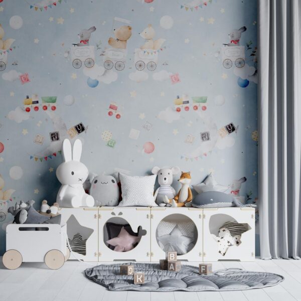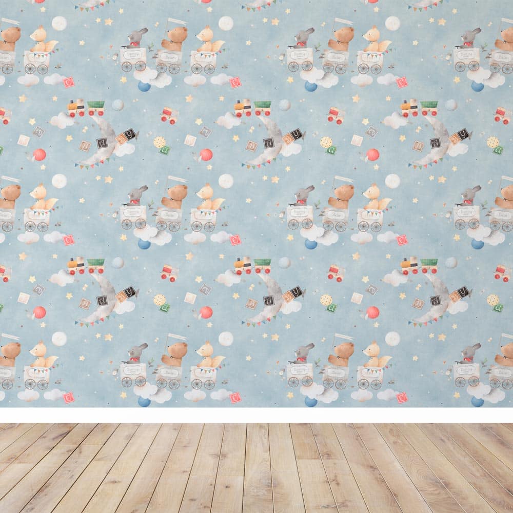 Stap in voor een vrolijk avontuur met kinderbehang Treintje met vrolijke dieren! Dit speelse behang neemt je kind mee op reis in een kleurrijk treintje vol lachende dieren, die samen door een fantasierijk landschap rijden. De levendige illustraties en zachte kleuren zorgen voor een gezellige, energieke sfeer waarin spelen en dromen centraal staan.