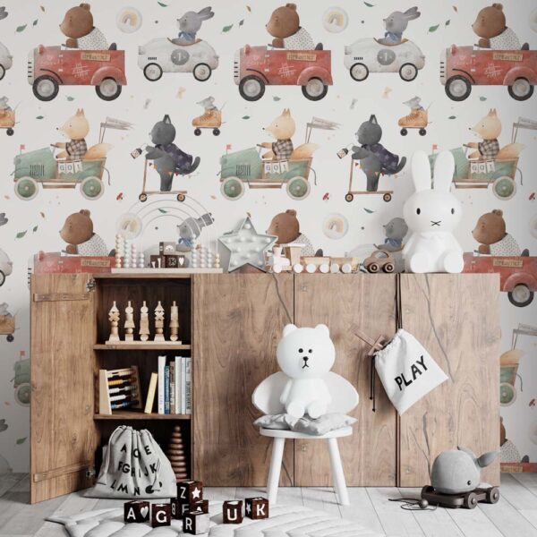 Maak van de kinderkamer een vrolijke speelwereld met kinderbehang Vrolijke dieren in auto. Lachende dieren rijden samen op avontuur in kleurrijke auto’s en zorgen direct voor een speelse, energieke sfeer. De grappige illustraties prikkelen de fantasie en nodigen uit tot eindeloos verzinnen van verhalen. Perfect voor een kinderkamer waar plezier, beweging en creativiteit centraal staan.