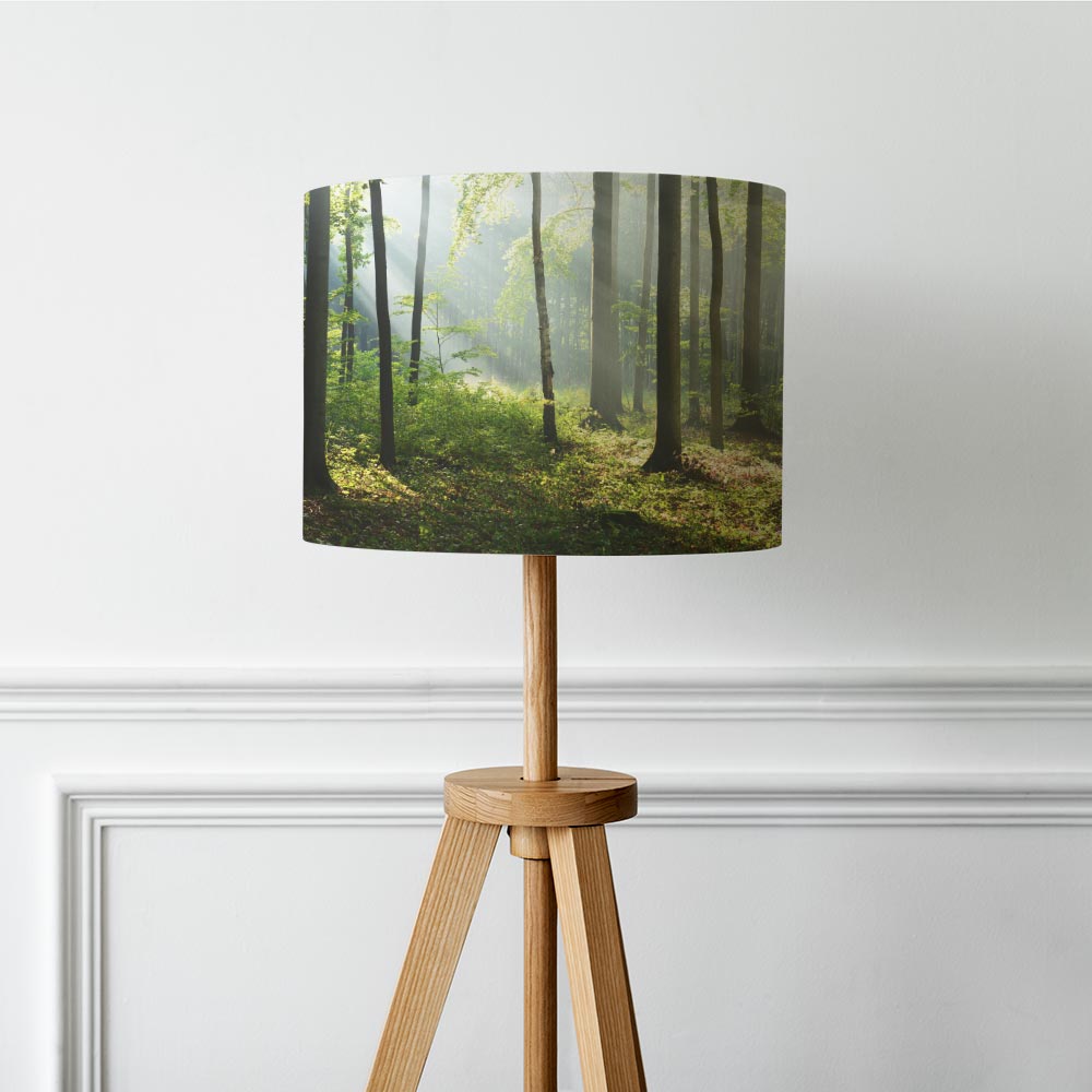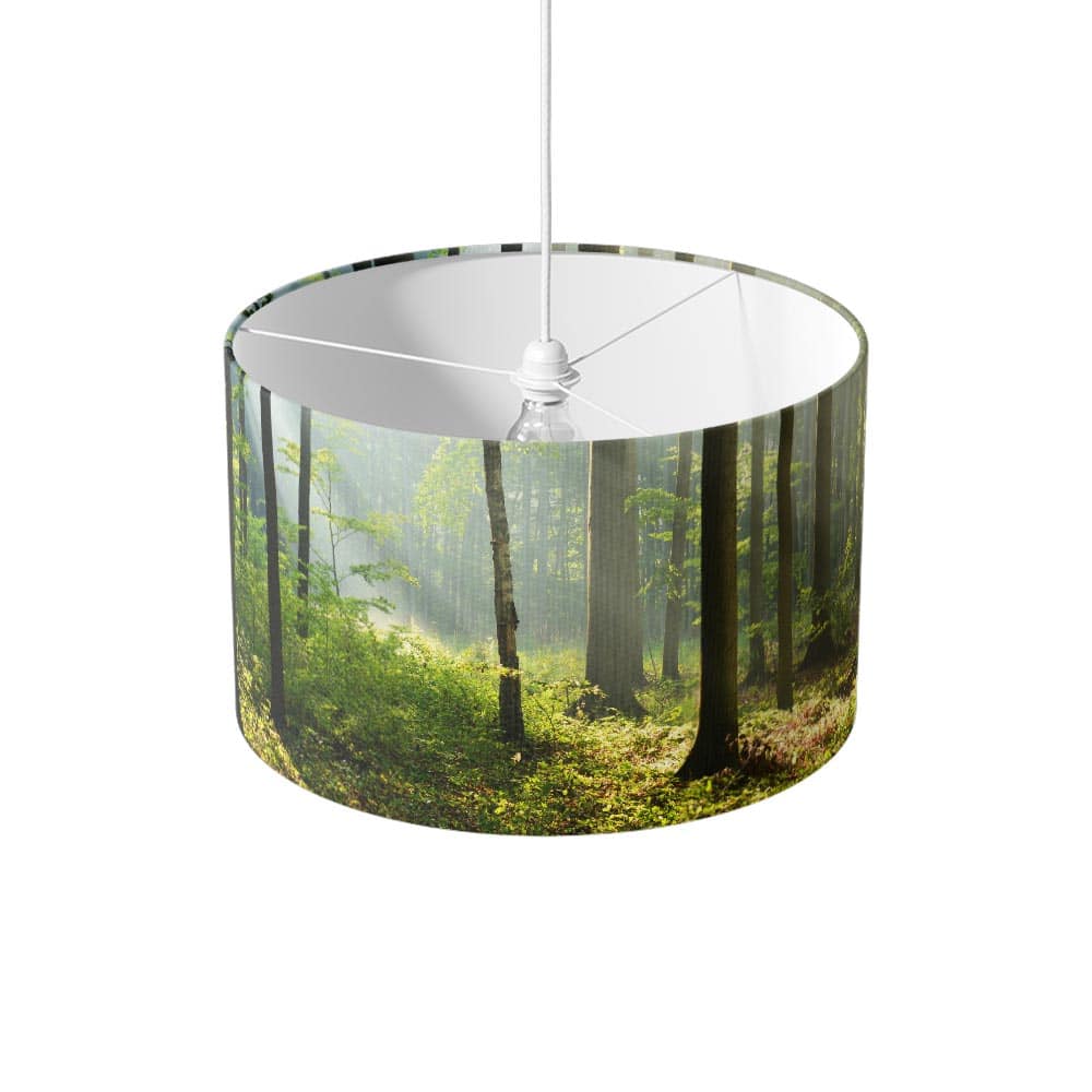 Laat de warmte van de ochtendzon je interieur verlichten met deze sfeervolle lampenkap. Het serene beeld van zonnestralen die door het bladerdak vallen, creëert een rustgevende en natuurlijke ambiance. Perfect om een vleugje bosmagie in de woonkamer, slaapkamer of leeshoek te brengen.