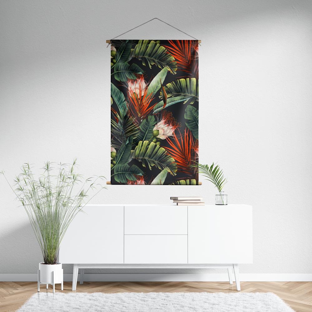 Breng een levendige, tropische sfeer in huis met de textielposter Tropische bladeren en bloemen. Kleurrijke bloemen en weelderige groene bladeren creëren een frisse en sfeervolle wanddecoratie, perfect voor een natuurlijke en exotische interieurstijl.