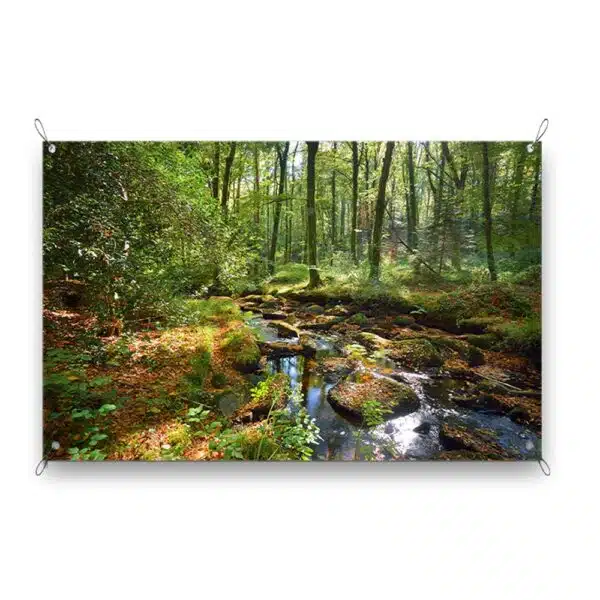 Een tuinposter Groen bos en beek is dé ‘finishing touch’ voor jouw tuin! Hang de poster aan een schutting, of aan de muur, of misschien in jouw terrasoverkapping en je hebt er zeker nog jaren plezier van. De trend van nu is om de tuinposter te bevestigen op een (zelfgemaakt) houten frame en dan op te hangen. Dit geeft nog meer sfeer in de tuin.