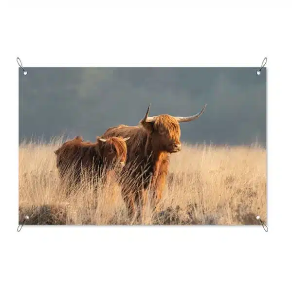 Een tuinposter Schotse Hooglander met kalf is dé ‘finishing touch’ voor jouw tuin! Hang de poster aan een schutting, of aan de muur, of misschien in jouw terrasoverkapping en je hebt er zeker nog jaren plezier van. De trend van nu is om de tuinposter te bevestigen op een (zelfgemaakt) houten frame en dan op te hangen. Dit geeft nog meer sfeer in de tuin.