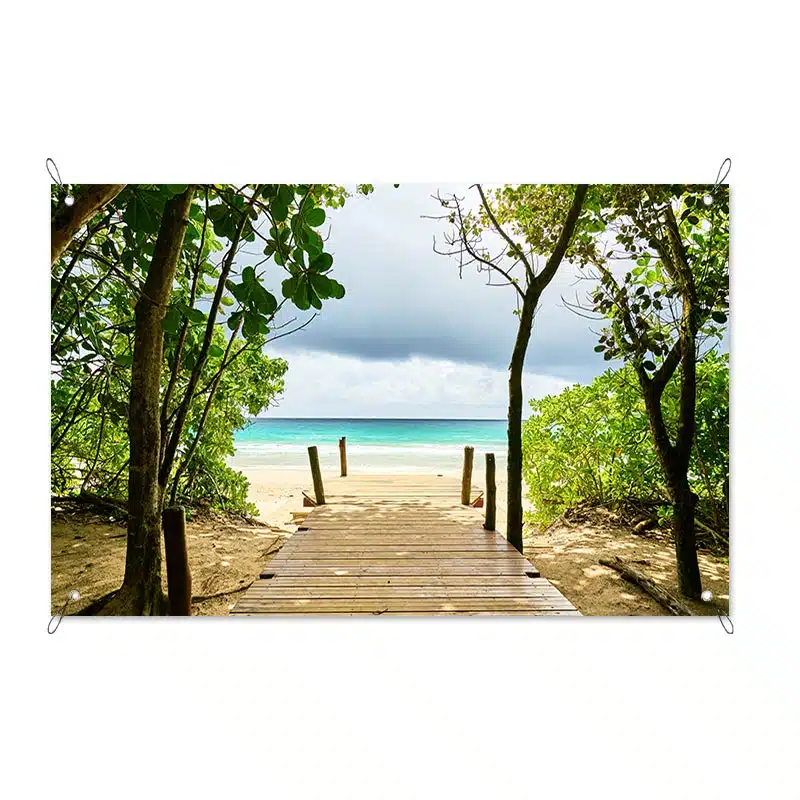 Een tuinposter Steiger naar tropisch strand is dé ‘finishing touch’ voor jouw tuin! Hang de poster aan een schutting, of aan de muur, of misschien in jouw terrasoverkapping en je hebt er zeker nog jaren plezier van. De trend van nu is om de tuinposter te bevestigen op een (zelfgemaakt) houten frame en dan op te hangen. Dit geeft nog meer sfeer in de tuin.